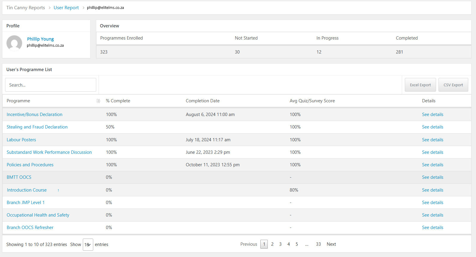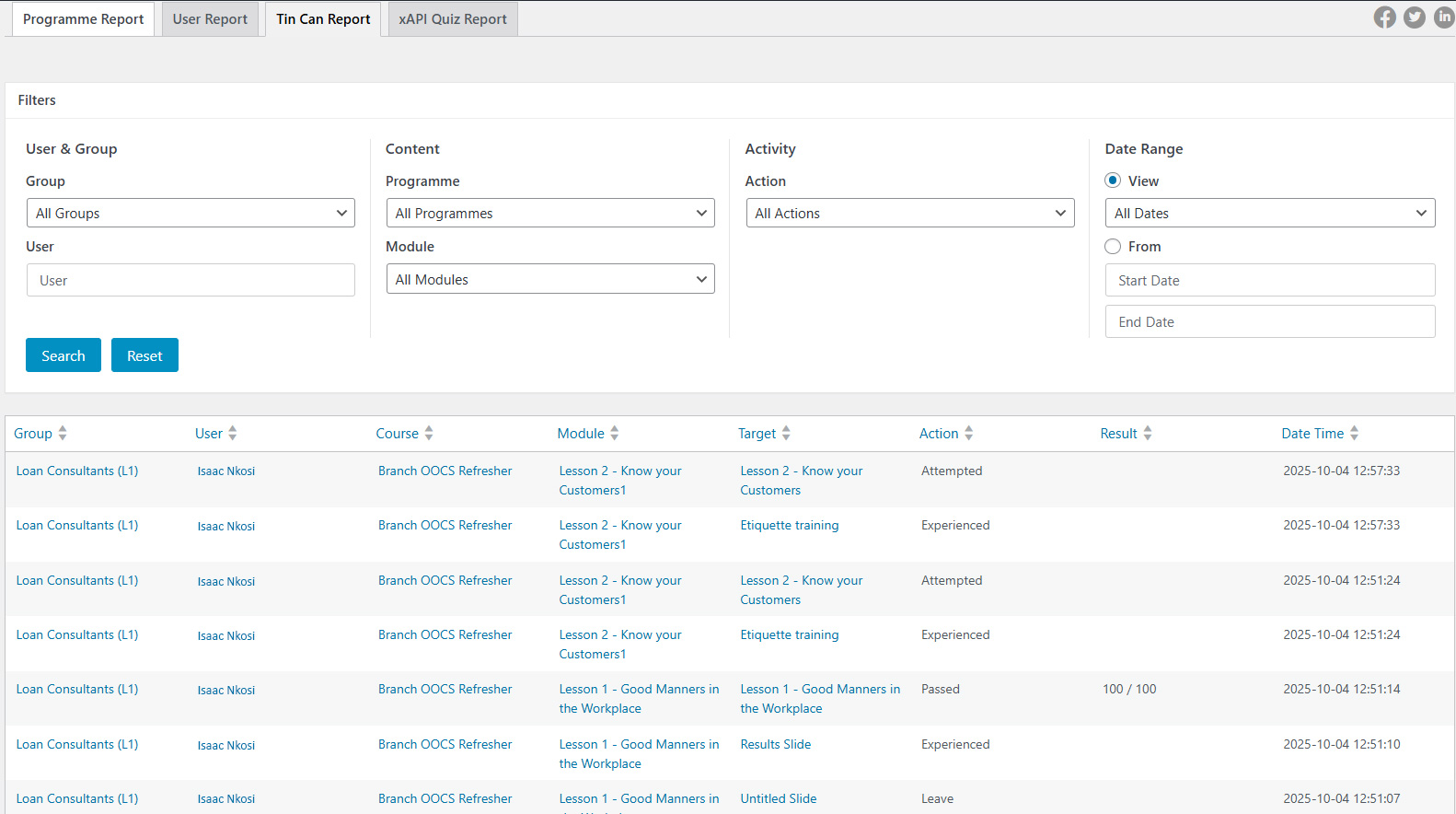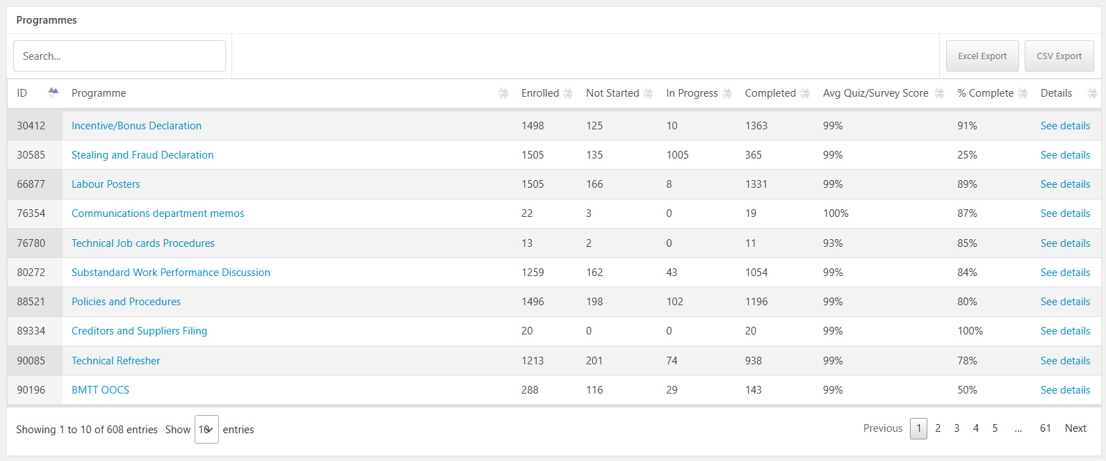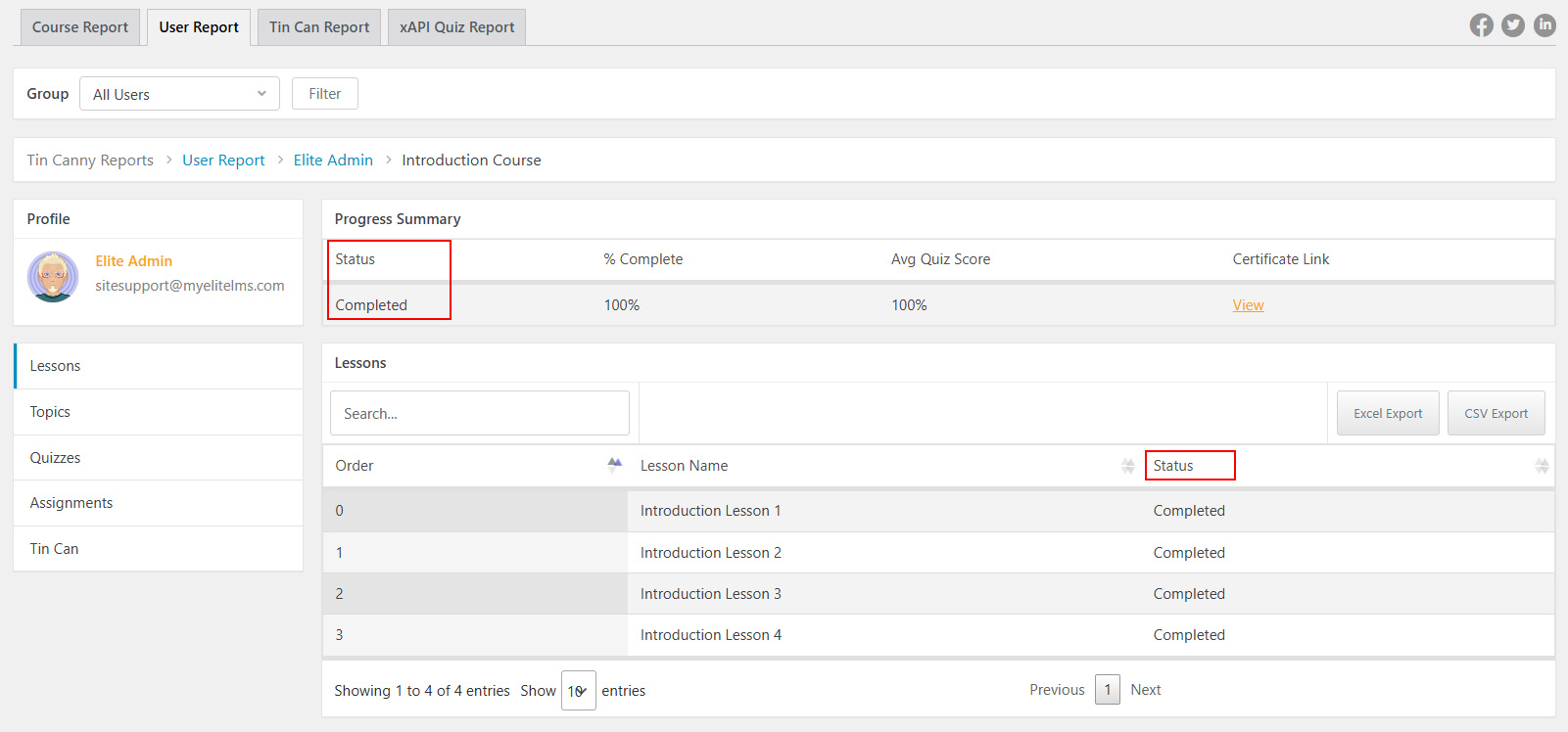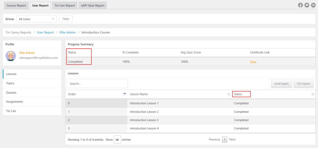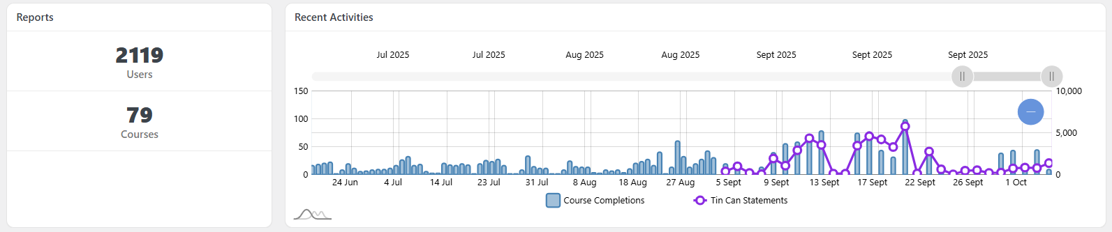 Elite LMS supports the upload of SCORM and xAPI files with a built-in LRS (learning record store), and full reporting capabilities for SCORM and xAPI data. From course records to quiz answers, SCORM / xAPI records to H5P, drill down and summary level reporting, EliteLMS does it all.