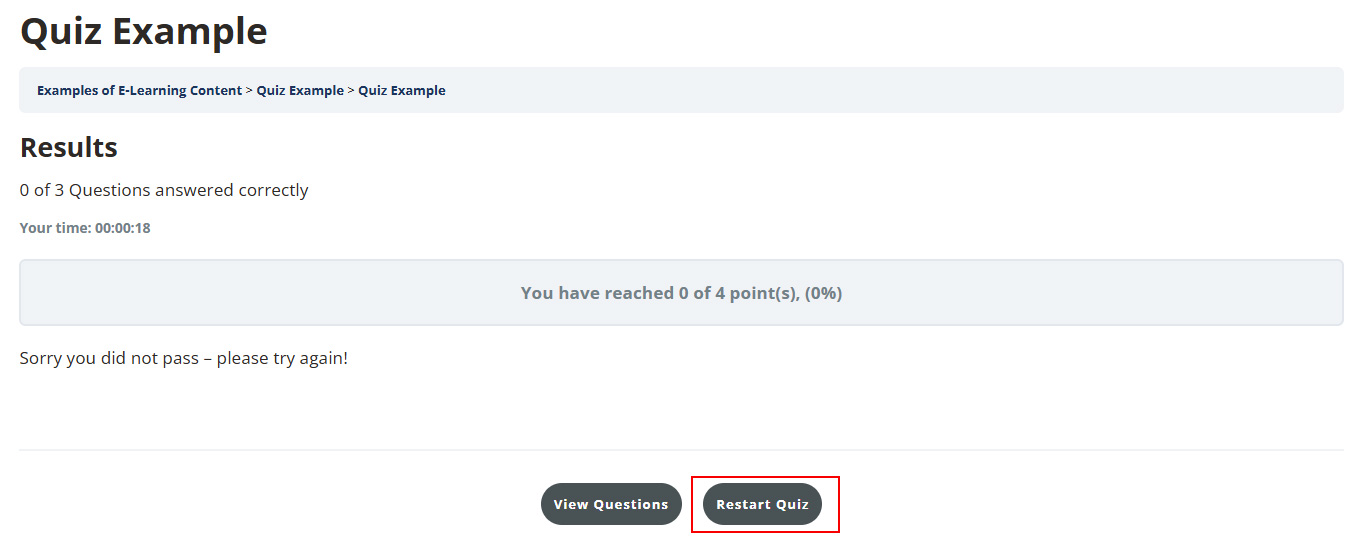 Where the user is not competent (or similar), the system must allow the user to retake the quiz or part of the quiz (unlimited).